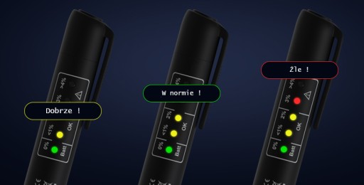 Na opakowaniu znajduje się tabela ilustrująca poziomy zanieczyszczenia. Wynik testu sygnalizowany jest odpowiednim kolorem diody: