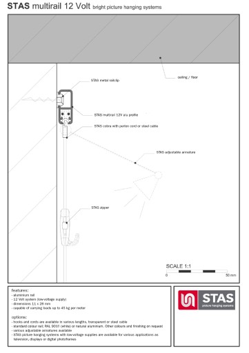 STAS Multirail jest opatentowanym na całym świecie systemem zawieszenia obrazów wyposażonym w zintegrowany z szyną przewód zasilania 12V (niskie napięcie). Oprawy oświetlenia mogą być „wkliknięte” do szyny w dowolnym miejscu, aby dokładnie oświetlić obiekty na ścianie.