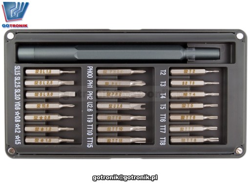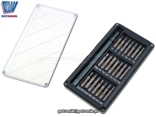 Zestaw 21 bitów precyzyjnych ze stali narzędziowej S2 wraz z aluminiowym wkrętakiem magnetycznym umieszczone w ergonomicznym plastikowym etui z magnetycznym zamknięciem. Taki zestaw bitów to niezbędne narzędzie do precyzyjnych prac w zakresie napraw i serwisowaniu smartfonów, konsol do gier, urządzeń przenośnych, laptopów, komputerów stacjonarnych, tabletów i innych urządzeń elektroniki użytkowej, rtv, agd, gsm. Wewnątrz etui bity są rozmieszczone i pogrupowane, a magnetyczna taca przytrzymuje je na swoim miejscu w trakcie transportu. Ergonomiczny aluminiowy uchwyt zapewnia wysoki moment obrotowy. Zestaw idealnie nadaję się na niepowtarzalny prezent dla elektronika lub hobbysty majsterkowicza.