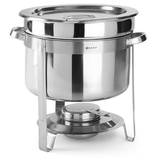 Podgrzewacz stołowy do zup o pojemności 8 l na paliwo. Wykonanie - stal chromowa. Pokrywka z wycięciem na chochlę. W wyposażeniu pojemnik stalowy z pokrywką mm oraz naczynie na pastę.