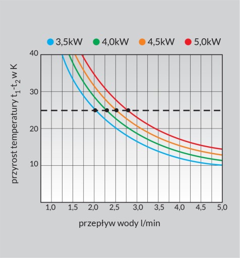 Wydajność ogrzewacza w zależności od mocy i przepływu