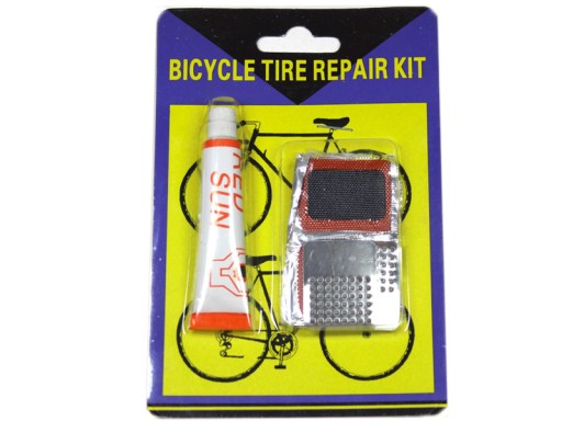 Zestaw naprawczy do dętek rowerowych, w skład którego wchodzą różnego rodzaju łatki oraz klej do reperacji dętek. Zestaw naprawczy jest niezbędnym akcesorium dla każdego użytkownika roweru.