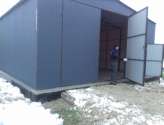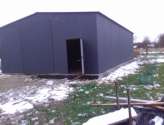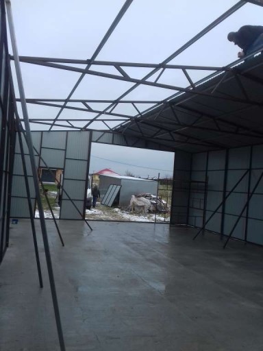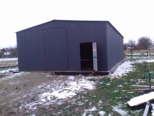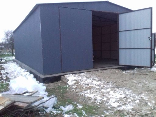Garaż blaszany o wymiarach 8x15m z bramą otwieraną.