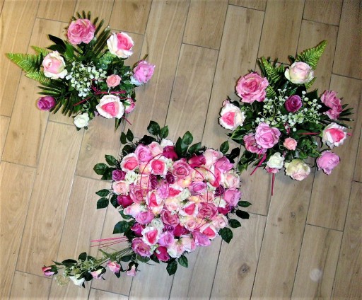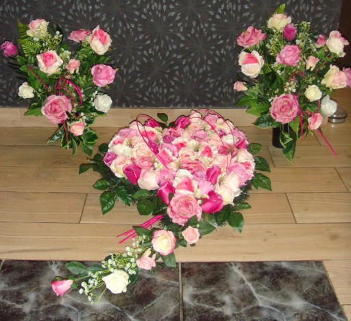 Na tej aukcji oferujemy Państwu bardzo ciekawy, nietuzinkowy komplet - stroik na grób albo do dekoracji wykonany w kształcie serca w kolorystyce jak na zdjęciach (odcienie różu) + 2 bukiety w wkładach do wazonów (wystarczy włożyć do posiadanego wazonu).