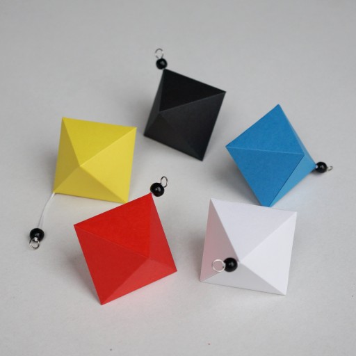 Przedmiotem sprzedaży jest ręcznie wykonany zestaw zawieszek - pięciu kolorowych ośmiościanów - przeznaczonych do montażu do naszej karuzeli.