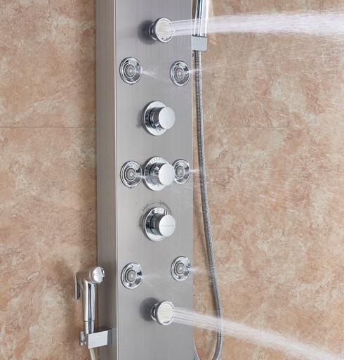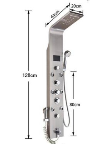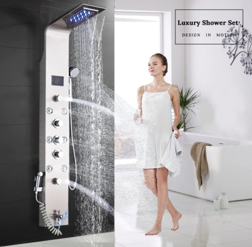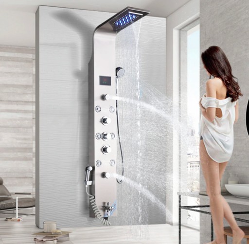 Piękny i nowoczesny wielofunkcyjny panel prysznicowy z oświetleniem LED. Do wykonania panelu prysznicowego zastosowano najwyższej klasy stal nierdzewną, mosiądz oraz najwyższej jakości tworzywo, które jest bardzo łatwe w utrzymaniu czystości. Panel z deszczownicą i hydromasażem jest gotowy do montażu zaraz po jego otrzymaniu. W zestawie znajduje się wszystko co konieczne jest do korzystania z panelu. Panel wyposażony został w system kurków, który umożliwia dokładne sterowanie zarówno siłą i temperaturą strumienia jak również sposobem, którym ma wypływać. Panel wygląda niezwykle ekskluzywnie i elegancko. Doskonale komponuje się z otoczeniem i wpływa na wygląd całej łazienki. Panel prysznicowy z deszczownicą i bidetem zapewni ci wspaniałe doświadczenia przez wiele lat.