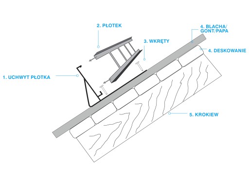 Kompletny płotek śniegowy U składa się z uchwytów płotka U (1) i płotka (2). Przeznaczony jest do montażu na dachach spadzistych pokrytych blachą płaska lub trapezową, gontami, bitumicznymi, papą itp. Montaż płotka należy wykonać na wysokości murłaty lub w odległości nie większej niż 800 mm od niej. Mocowanie uchwytu (1) najlepiej wykonać w linii krokwi (kontrłaty lub deski) śrubami o Ø 6 mm i długości zapewniającej połączenie z konstrukcja dachu np. w określonych przypadkach jeżeli zachodzi taka potrzeba należy wykonać konstrukcję pomocniczą (np łatę pomocniczą). Uchwyt U powinien na całej swej długości być podbudowany. Montaż płotka (2) do uchwytu (1) odbywa się "na zatrzask" i nie wymaga stosowania połączeń śrubowych. Ilość uchwytów potrzebnych do zamontowania płotków zależy od kąta nachylenia dachu (im większy kąt tym większa ilość uchwytów) oraz długości połaci. Dla dachów o długości połaci powyżej 6 m należy zwiększyć ilość uchwytów lub zastosować drugi rząd płotków. Ilość uchwytów zależy od kąta nachylenia dachu.