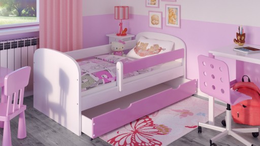 Piękne, bardzo mocne i wykonane z najwyższej jakości materiałów łóżko dziecięce w super edycji MIMI 90x160 ze stelażem, materacem, podwójną barierką ochronną i podwójną szufladą.