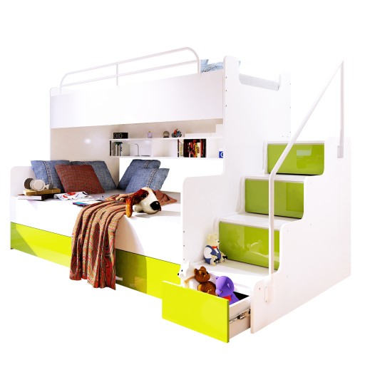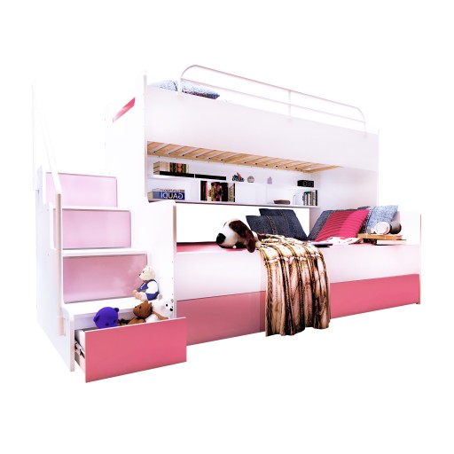 - Schodki z boku łóżka pełnią funkcję pojemników, które wysuwa się na prowadnicach rolkowych,