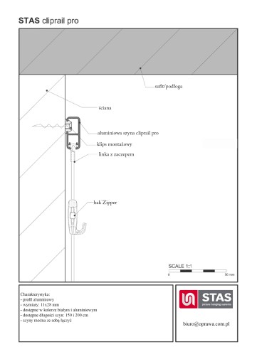 Szyna do wieszania obrazów Cliprail Pro aluminium 200 cm renomowanej holenderskiej firmy STAS. To kompletny zestaw do zamontowania na ścianie.