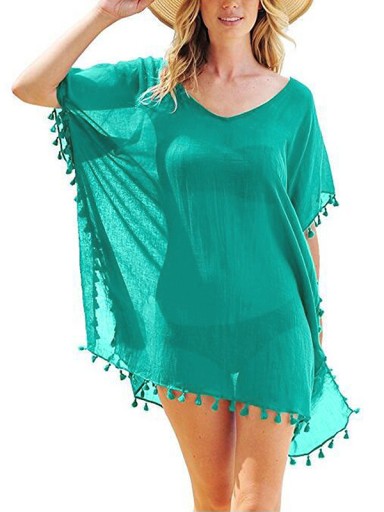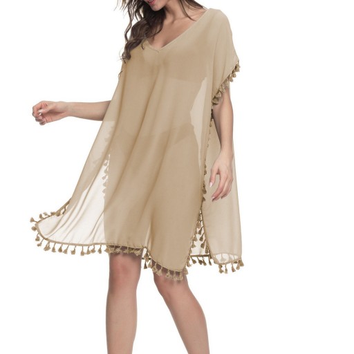 LEKKA SZYFONOWA TUNIKA PLAŻOWA Z OZDOBNYMI FRĘDZELKAMI