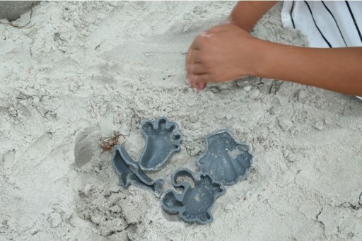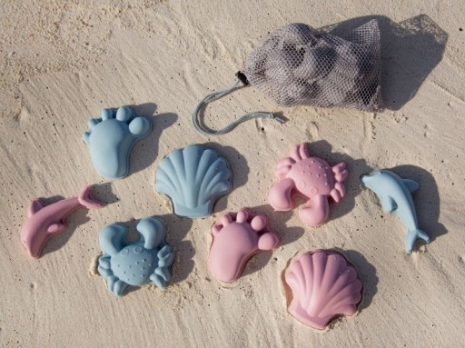 W zestawie cztery miękkie foremki w kształcie kraba, delfina, muszelki i dziecięcej stópki, całość zapakowana w siateczkę ściąganą sznurkiem.