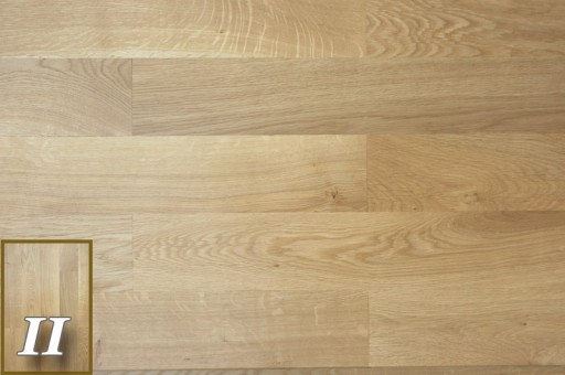 Klasa II - charakteryzuje się usłojeniem mieszanym, z przewagą słoi. Kolorystyka parkietu jest bardziej zróżnicowana, mogą występować naturalne przebarwienia. Dopuszczalne są sęki zdrowe i zrośnięte do 10 mm oraz sęki zepsute do 5 mm. Mogą występować zanikowe fragmenty bieli. Dopuszczalne są pęknięcia powierzchniowe i piorunowe o długości do 15 mm. Z uwagi na niemożliwe do uniknięcia różnice przy sortowaniu, dopuszcza się w danej klasie do 2% deszczułek o niższej jakości.