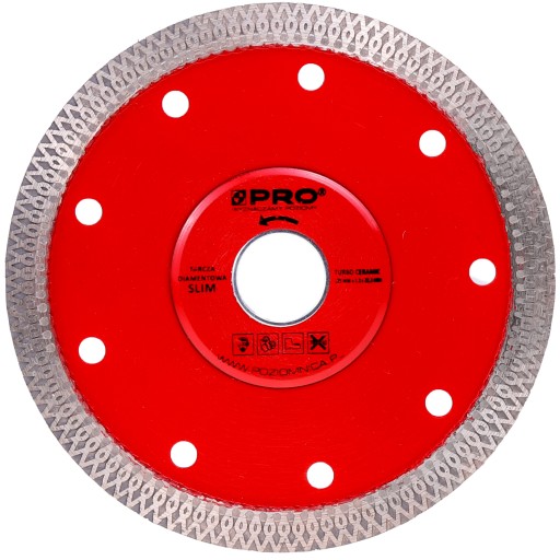 Wytrzymała cienka tarcza do cięcia twardej glazury. Zastosowanie wieńca o zmiennym przekroju poprawia zdolność do odprowadzenia urobku i ciepła oraz powoduje zmniejszenie sił tarcia, co ma decydujący wpływ na zwiększenie tempa cięcia. Zwiększona grubość tarczy w strefie mocowania powoduje, że przy cięciu pod kątem tarcza nie odkształca się. Dzięki otworom tarcza ma zapewnione optymalne chłodzenie.