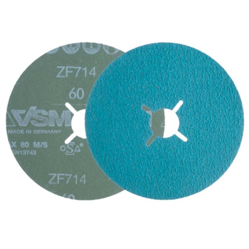 Dysk fibrowy 125 mm, wykonany z materiału VSM ZF714 z ziarnem cyrkonowym o właściwościach samoostrzących. Polecany przede wszystkim do szlifowania stali zwykłej, nierdzewnej, stopowej i żeliwa.