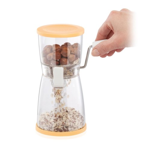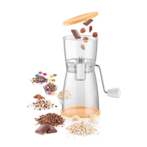 Doskonały do łatwego i szybkiego rozdrabniania i mielenia orzechów włoskich, laskowych, migdałów, pistacji, orzechów nerkowca, czekoladowych lentilek, czekolady, biszkoptów i herbatników do dekorowania ciast, lodów itp.