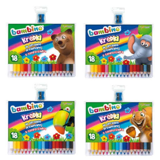Wysokiej jakości kredki z glinki kaolinowej w drewnianej oprawie. Charakteryzują się wyjątkowo intensywnymi i nasyconymi kolorami. Doskonale kryją, idealnie nadają się do rysowania, wypełniania dużych powierzchni i wykonywania miękkich przejść pomiędzy kolorami. Kredki są grube, odpowiednio wyważone, przez co idealnie dopasowują się do małej dłoni dziecka. Produkowane są w Polsce, w zgodności z dyrektywą Parlamentu Europejskiego i Rady w sprawie bezpieczeństwa zabawek oraz rozporządzeniem Ministerstwa Gospodarki w sprawie zasadniczych wymagań dla zabawek, co gwarantuje bezpieczeństwo kredek Bambino. Licencja - Bambino, ilość kolorów - 18, ilość sztuk w opakowaniu - 18, cechy szczególne - kredki o przekroju 7 mm z temperówką w zestawie.