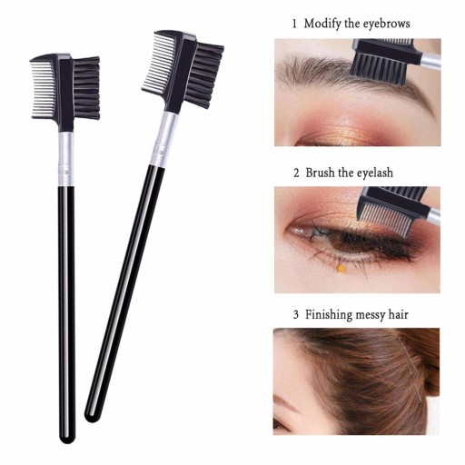 Szczoteczka układa brwi do określonego kształtu a grzebyczek usuwa nadmiar tuszu z kępek rzęs.