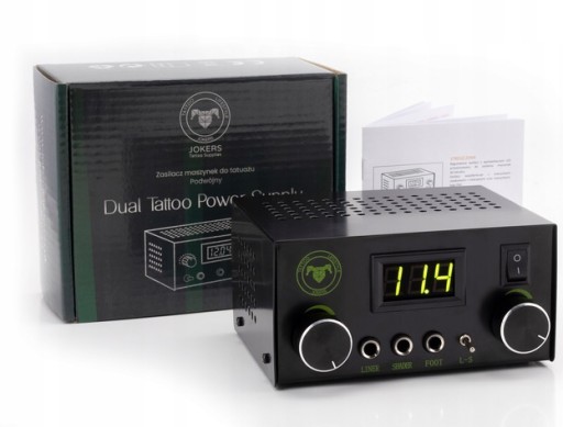 - 3. Stalowy firmowy zasilacz Jokers tattoo life style plus okablowanie (start/stopką oraz clip cordem) oraz kabel zasilający do Polskiego gniazda.