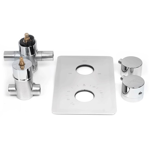 Sercem zestawu jest 2-funkcyjny mieszacz podtynkowy z termostatem marki VERNET. Korpus mieszacza jest masywnym odlewem mosiężnym. Pokrętła to stal nierdzewna pokryta chromem. Rozeta wykonana jest ze stali nierdzewnej. Górne pokrętło włącza oraz reguluje ciśnienie wody w deszczownicy oraz w słuchawce. Dolne pokrętło to termostat, służy on do regulacji temperatury wody. Termostat zastosowany w tym modelu to głowica renomowanej marki VERNET. Pokrętło termostatu posiada funkcję blokady przy 38 stopniach, po naciśnięciu przycisku możliwe jest ustawienie wyższej temperatury. Blokada ma za zadanie zapobiec sytuacji w której użytkownik przypadkowo może ulec poparzeniu strumieniem gorącej wody.