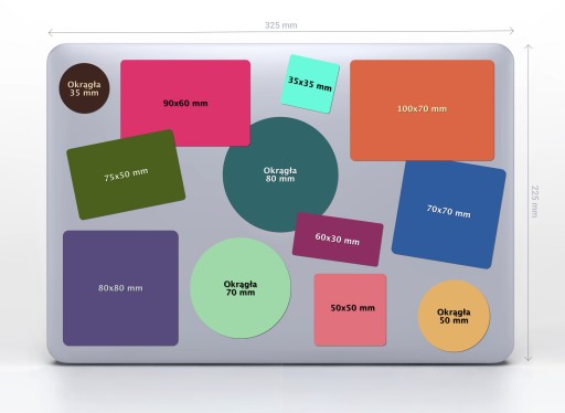 - 2 zakupione pakiety naklejek mogą zawierać np. 320 szt. okrągłych naklejek 35 mm i 144 szt. prostokątnych naklejek 70x50 mm