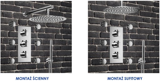 Sercem zestawu jest 3-funkcyjny mieszacz podtynkowy z termostatem marki INEA. Korpus mieszacza jest masywnym odlewem mosiężnym. Pokrętła to stal nierdzewna pokryta chromem. Rozeta wykonana jest ze stali nierdzewnej. Górne pokrętło obsługuje dwie funkcje.* Dolne pokrętło reguluje ciśnienie w dyszach hydromasujących. Termostat zastosowany w tym modelu to głowica renomowanej marki VERNET. Pokrętło termostatu posiada funkcję blokady przy 38 stopniach, po naciśnięciu przycisku możliwe jest ustawienie wyższej temperatury. Blokada ma za zadanie zapobiec sytuacji w której użytkownik przypadkowo może ulec poparzeniu strumieniem gorącej wody.