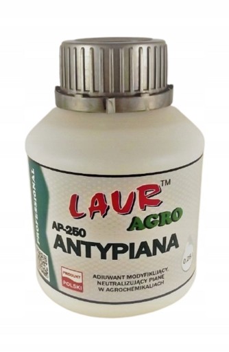 Profesjonalny neutralizator piany AGRO LAUR AP-250 antypiana. Skoncentrowany adiuwant modyfikujący, neutralizator piany w roztworach cieczy roboczej agrochemikaliów. Dedykowany do przeciwdziałania i skutecznego niwelowania powstającej piany w opryskiwaczach i zbiornikach roboczych.