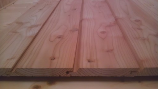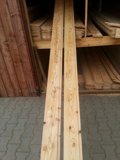Deski elewacyjne z tzw. przesuniętym piórem wykonane z modrzewia, o wymiarach: