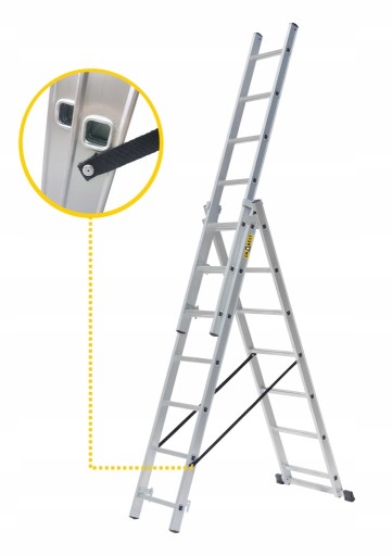 Drabina posiada aluminiowe prowadnice, które zamontowane są wokół podłużnic. Element ten ułatwia rozsuwanie drabiny.