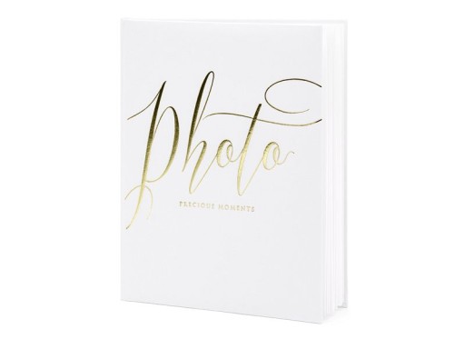 Album na zdjęcia oprawiony papierem w kolorze białym ze złotym napisem Photo, precious moments,