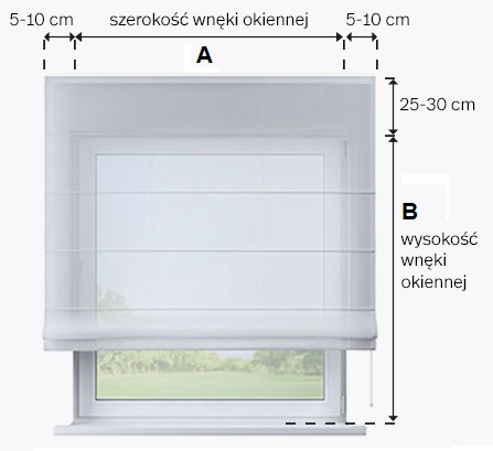 Do szerokości wnęki okiennej (A) należy dodać po minimum 5 centymetrów z każdej strony aby otrzymać właściwą szerokość rolety.