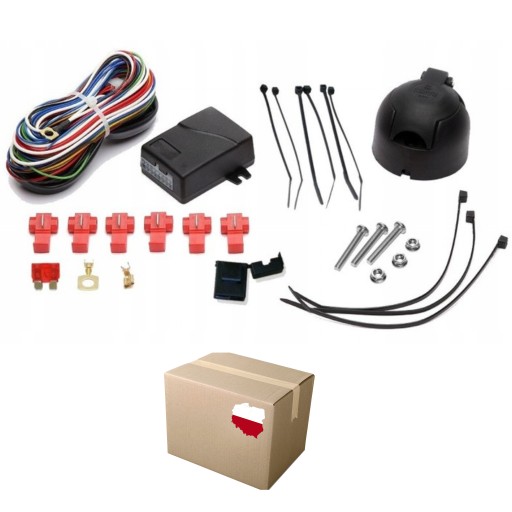 Uniwersalny, kompletny moduł 7-PIN haka holowniczego wraz z gniazdem 7-PIN, zestawem instalacyjnym oraz instrukcją montażu.