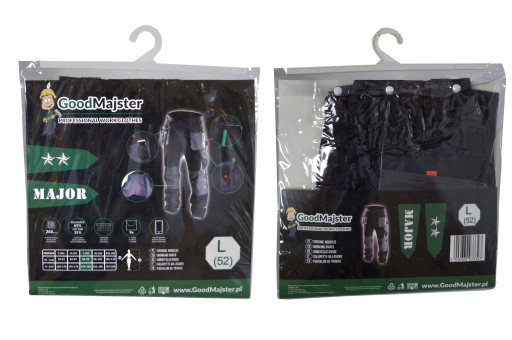 Spodnie marki GoodMajster są zapakowane w wygodne opakowania, które posiadają czytelną etykietę, oraz wieszak.