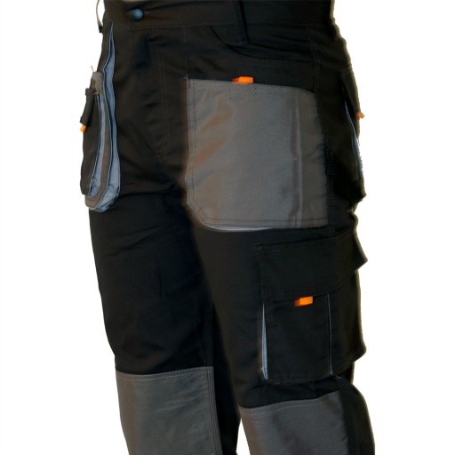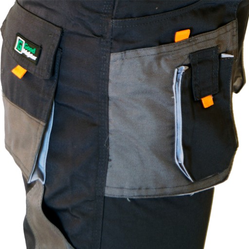 W spodniach wzmocniono miejsca narażone na najszybsze uszkodzenia i przetarcia tj.kolana oraz kieszenie. (zastosowano materiał Cordura).