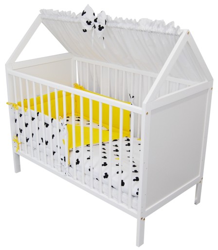 Zestaw zawiera: łóżeczko/tapczanik Jaś 3 domek 120x60 w kolorze białym, baldachim, ochraniacz, poszewkę na kołderkę i poduszkę, kołderkę i poduszkę, materac piankowy, prześcieradełko.