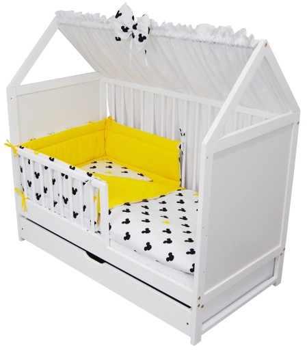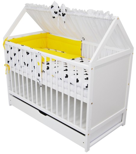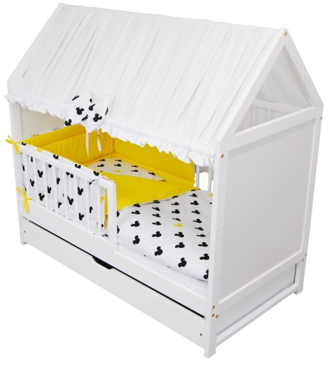 Zestaw zawiera: łóżeczko/tapczanik Jaś domek 120x60 z szufladą w kolorze białym, baldachim, ochraniacz, poszewkę na kołderkę i poduszkę, kołderkę i poduszkę, materac piankowy, prześcieradełko.