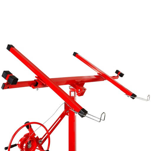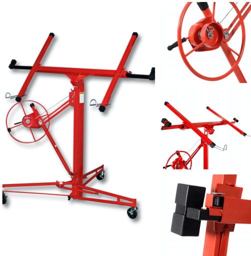 Podnośnik do płyt gipsowych podnoszący na 3,55M . Podnośnik pozwala na szybką oraz bezproblemową pracę. Narzędzie do pracy wykończeniowych, bardzo proste w obsłudze, posiadające mechanizm zapobiegający samoczynnemu złożeniu.