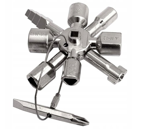 - Wielofunkcyjny klucz pasujący do najpopularniejszych systemów zamykania stosowanych w szafach rozdzielczych, a także skrzynkach systemów klimatyzacyjno-wentylacyjnych, wodno-kanalizacyjnych, gazowych oraz wszelkiego rodzaju i