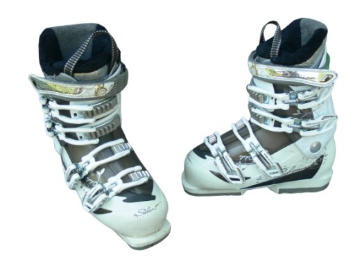 Używane buty narciarskie SALOMON DIVINE 770, rozm. 23,0cm, zmierzona dł. wkładki 23,5cm, dł.skorupy buta 278mm ; klamry metalowe, mikroregulacje na 4 klamrach, makroregulacje na 2 górnych klamrach.