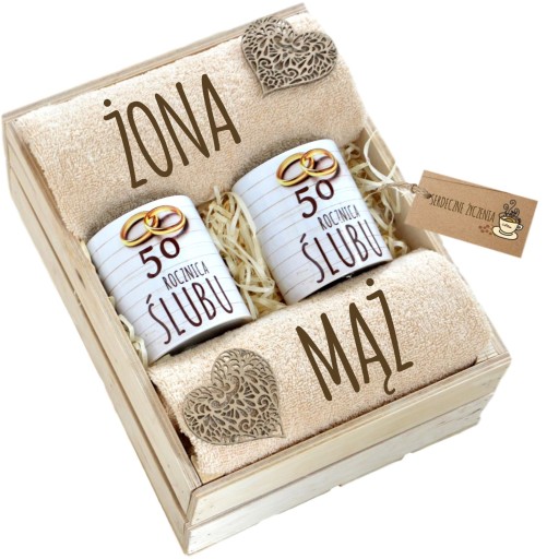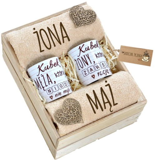 Oryginalny zestaw ECO w drewnianej skrzynce, stanie się wspaniałym prezentem na każdą okazję.Wybierz ten wyjątkowy komplet jako prezent na parapetówkę, ślub lub rocznicę ślubu, a sprawisz obdarowanej parze ogromną radość. Na KUBKACH i RĘCZNIKACH znajdą się ORYGINALNE trwałe nadruki . Tak uroczą formą podarunkową sprawisz, że każde wspólne picie kawy czy herbaty, zamieni się w uroczą chwilę.