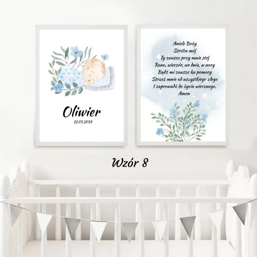 Na jednym z plakatów znajduje się grafika z personalizacja dziecka. Na drugim z plakatów umieszczony jest tekst modlitwy do Anioła Stróża.
