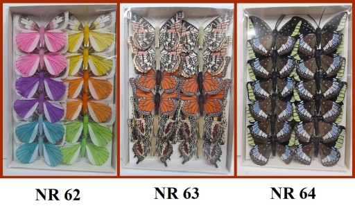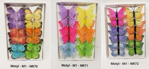 - Motyle są sprzedawane w kompletach po 12 sztuk jednego wzoru w różnych kolorach (jak na zdjęciu).