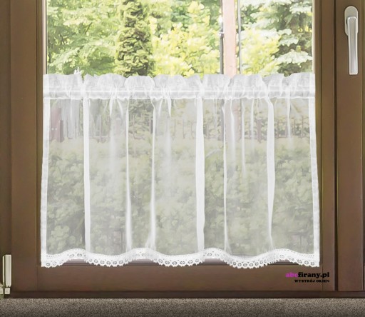 Na zdjęciu firany pokazane są w komplecie z lambrekinem woalowym, u dołu wyciętym w kształcie łuku.