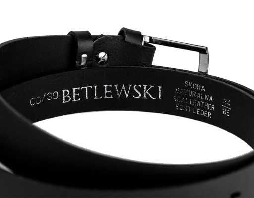 Na końcu paska znajduje się wytłoczone drzewko - logo marki Betlewski®. Oryginalność produktu potwierdzają także znakowania po wewnętrznej stronie paska.