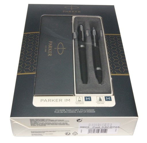 Zestaw pióro wieczne oraz długopis Parker IM czarny CT to połączenie prostej elegancji i użytkowej funkcjonalności. Produkty IM są synonimem miejskiego szyku. Znakomity zestaw Parker na prezent w kolorze głębokiej czerni. Pióro wieczne Parker IM Czarny CT