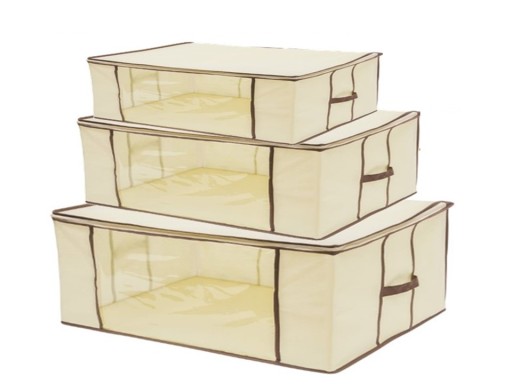 Skrzynie wykonane są z ekologicznego materiału NONWOVEN PP o gramaturze 80g/m2. Odpowiednia kalandracja i ułożenie włókien sprawiają, że zapakowane przedmioty mają doskonałą wymianę powietrza a jednocześnie doskonale są chronione przed kurzem, brudem, roztoczami, insektami itp. Materiał NONWOVEN nie jest toksyczny i nie posiada nieprzyjemnego zapachu. Okienko zostało wykonane z folii PCV bezftalanowej.