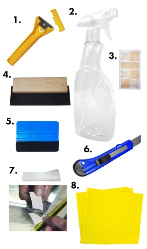 - Specjalnej gumowej rakli (pomocna w dokładnym czyszczeniu szyby z zabrudzeń oraz podczas wygładzania folii-pamiętaj by używać dużej ilości płynu montażowego)