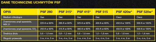 Dzięki usprawnieniom w obszarze podawania drutu uchwyty spawalnicze PSF zapewniają obecnie stabilniejszy łuk i wyższą jakość spoiny. Najnowszy uchwyt chłodzony cieczą PSF 520W to nasz najmocniejszy model, radzący sobie bez problemu z najbardziej wymagającymi zadaniami. Innowacyjny układ chłodzenia cieczą składający się z dwóch obwodów sprawia, że pomimo zwiększonej wydajności, uchwyt nie nagrzewa się nawet podczas bardzo wytężonej pracy. Mniejsza ilość ciepła oznacza sprawniejsze podawanie drutu i mniej przestojów na wymianę części eksploatacyjnych.