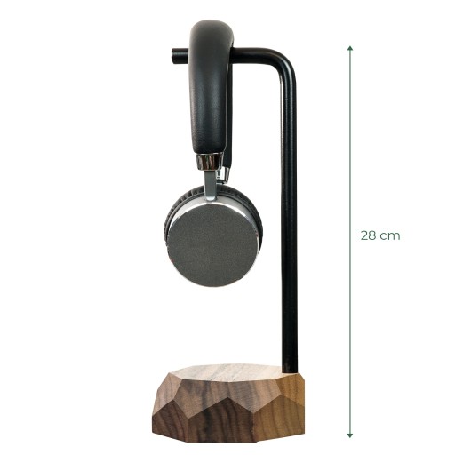 Stojak na słuchawki wykonany z drewna i metalowego prętu. Oryginalnie zaprojektowany wieszak na słuchawki wykonany ze stali pokrytej matowym czarnym kolorem podstawa ukształtowana w litym drewnie orzecha amerykańskiego.