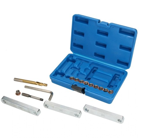 Zestaw został zaprojektowany do naprawy gwintów mocujących prowadnice zacisku hamulcowego: VW, AUDI, OPEL, FORD, dzięki zastosowaniu wysoko wytrzymałych wkładek ze stali wysokiej jakości.